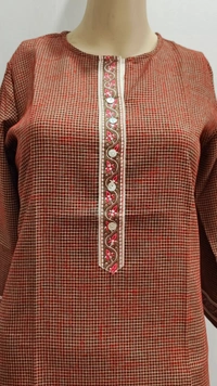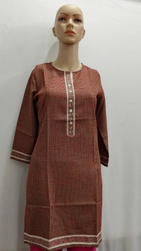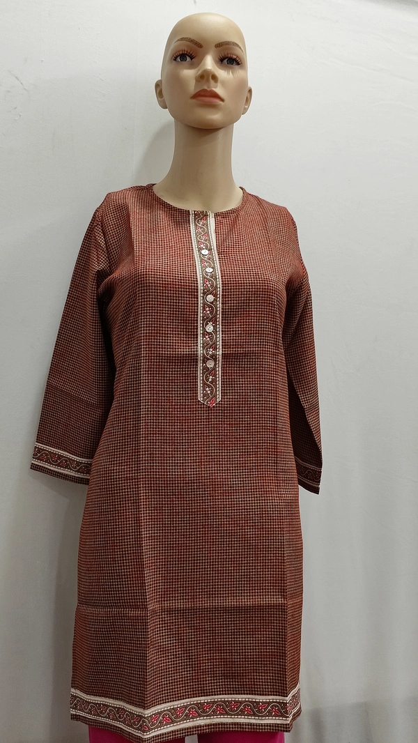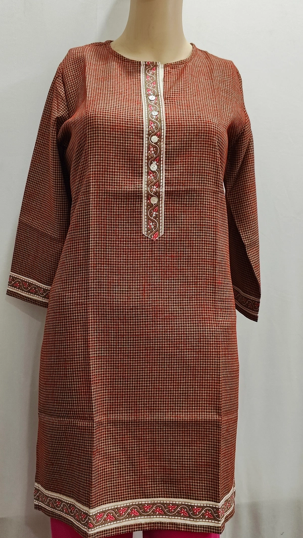 Rust Brown Check Button Patti Print Regular Kurti